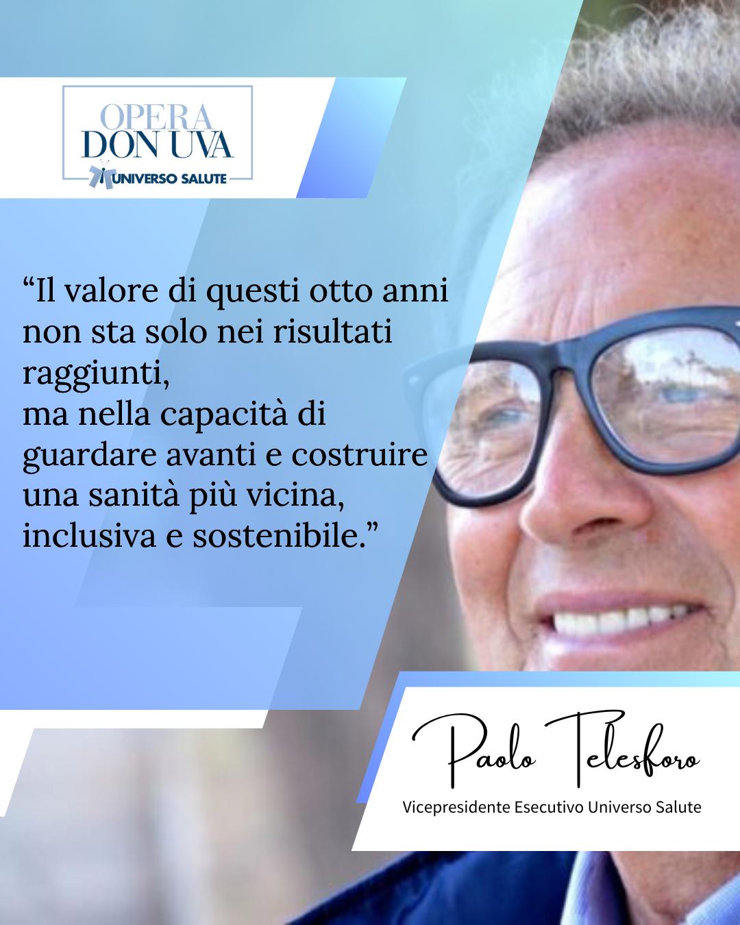 Nell’ottavo anniversario di Universo Salute, il vicepresidente esecutivo Paolo Telesforo formula gli auguri a tutta la Comunità di Don Uva evidenziando un aspetto: “La nostra forza nasce dalle persone: dai professionisti che ogni giorno mettono passione e competenza al servizio dei pazienti, e dalle comunità che ci hanno accolto e sostenuto in questo percorso.
